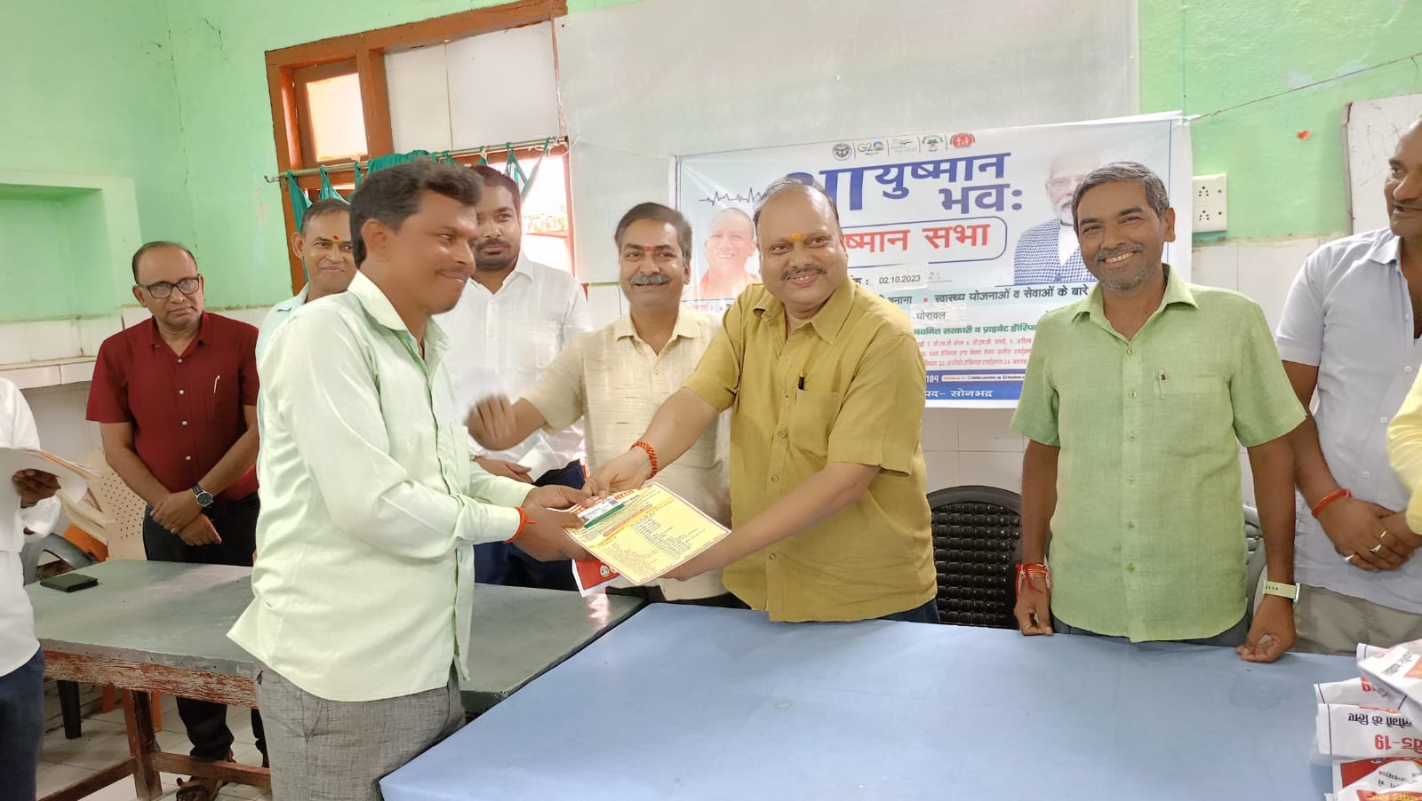 घोरावल(राजेंद्र मानव):-सोमवार को गांधी जयंती के शुभ अवसर पर सामूदाईक स्वास्थ्य केन्द्र घोरावल में आयुष्मान सभा का आयोजन किया गया कार्यक्रम का शुभारंभ नगर पंचायत घोरावल के पूर्व चेयरमैन श्री राजेश जी व अन्य भाजपा के पदाधिकारीयों द्वारा किया गया तथा पात्र लाभार्थियों को पी वी सी कार्ड व फल का वितरण किया गया व चेयरमैन द्वारा दूर दराज से आए लाभार्थियों को आयुष्मान के बारे में विस्तृत जानकारी दी गई मौके पर अधीक्षक डा. नरेंद्र सरोज, डा. ए पी सिंह चिकित्सा अधिकारी, अनिल यादव फार्मासिस्ट, भगवानदास आरोग्य मित्र, सीमा मौर्या एएनएम, आशाएं आदि उपस्थित रहे।