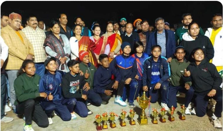 मैच समापन के उपरांत पुरस्कार वितरण समारोह की मुख्य अतिथि पूर्व विधायक /नगर पालिका अध्यक्ष रूबी प्रसाद के हाथो विजेता टीम की ट्रॉफी