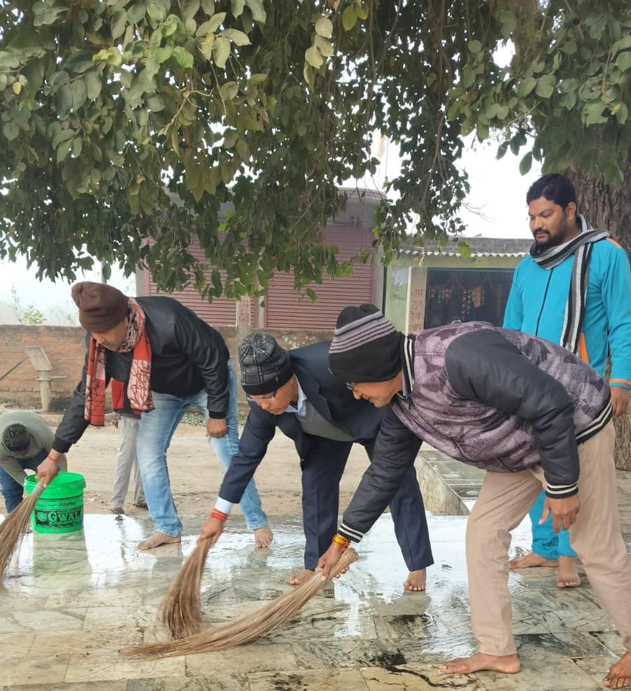 भाजपा कार्यकर्ताओं ने मंदिर प्रांगण की किया साफ सफाई।
