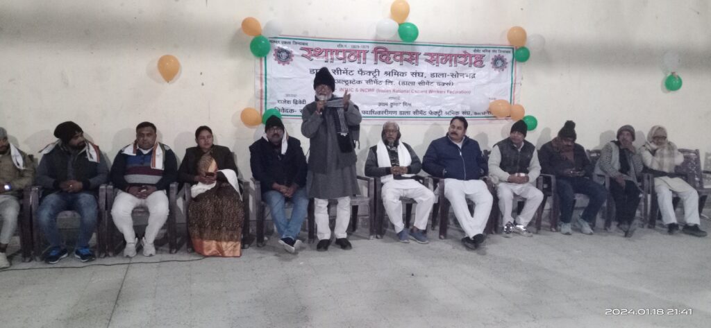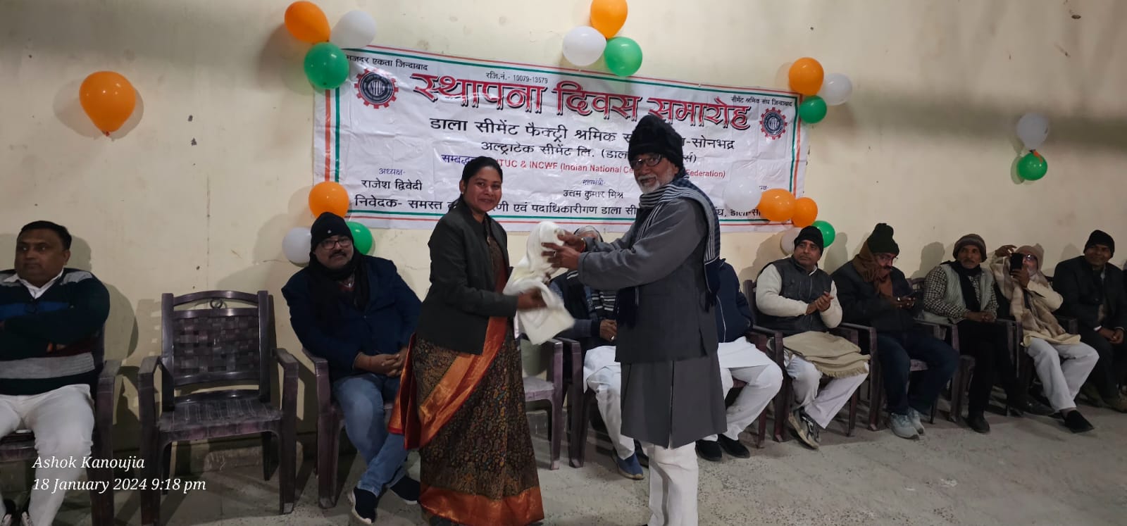 डाला: स्थानीय नगर स्थित अल्ट्राटेक लिमिटेड सीमेंट फैक्टरी में कार्यरत श्रमिक यूनियन संघ इंटक ने 7 वां स्थापना दिवस धूमधाम के साथ मनाया। कार्यक्रम में सर्वप्रथम यूनियन के महामंत्री उत्तम मिश्रा ने कर्मचारियों के सहयोग से कालोनी परिसर स्थित मंदिर पर सुन्दरकाण्ड पाठ का आयोजन किया जिसके बाद पूजन आरती कराते हुए प्रसाद वितरण कराया गया तत्पश्चात ABIC स्कूल प्रांगण में यूनियन के आमंत्रण पर नवनियुक्त डाला नगर चेयरमैन श्रीमती फुलवंती देवी के साथ मंगल जायसवाल व कई सभासद, इंटक यूनियन के जिला अध्यक्ष हरदेवनारायण तिवारी, इंटक के उपाध्यक्ष बृजेश तिवारी, नागेशमणी पाठक, हिंडालको यूनियन से यूनियन के नेता देवेंद्र शुक्ला, संजय काम्ती, डाला नगर व्यापार मंडल अध्यक्ष मुकेश जैन , डाला नगर ब्राह्मण समाज अध्यक्ष शिव प्रकाश शुक्ला, पंडित ओमप्रकाश तिवारी, राजू दूबे सहित अन्य अतिथियों का यूनियन अध्यक्ष राजेश द्विवेदी व महामंत्री एवं सीमेंट फेडरेशन के सचिव उत्तम मिश्रा ने अंगवस्त्र से सम्मानित किया उपस्थित वक्ताओं ने कर्मचारियों का उत्साहवर्धन किया नगर अध्यक्ष ने कर्मचारियों के हक के लिए कंधे से कंधा मिलाकर खड़े रहने की बात कही वहीं जिलाध्यक्ष हरदेवनारायण तिवारी ने मंच के माध्यम से प्रबंधन से अपील करते हुए कर्मचारियों की स्थिति में सुधार लाने की अपील की अंत में यूनियन के अध्यक्ष राजेश द्विवेदी ने उपस्थित कर्मचारियों एवं अतिथियों का आदर अभिवादन करते हुए आभार प्रकट किया,रात्रिभोज के साथ कार्यक्रम का समापन हो गया इस अवसर पर विनय पांडेय, उपाध्यक्ष दिलीप कुमार सिंह कोषाध्यक्ष अविनाश पति त्रिपाठी, प्रचार मंत्री राजेश सिंह,संयुक्त मंत्री राजेश कुमार,कार्यालय मंत्री ऋषिराज पाठक,विनय पांडे, दादू लाल शुक्ला, अतिश पाठक, अवध राय शंकर लाल, आशीष तिवारी,इकबाल खान, राजमणि,भारत पांडे, शिव प्रकाश, अनुज सिंह के साथ सैकड़ो कर्मचारी गण मौजूद रहे ।