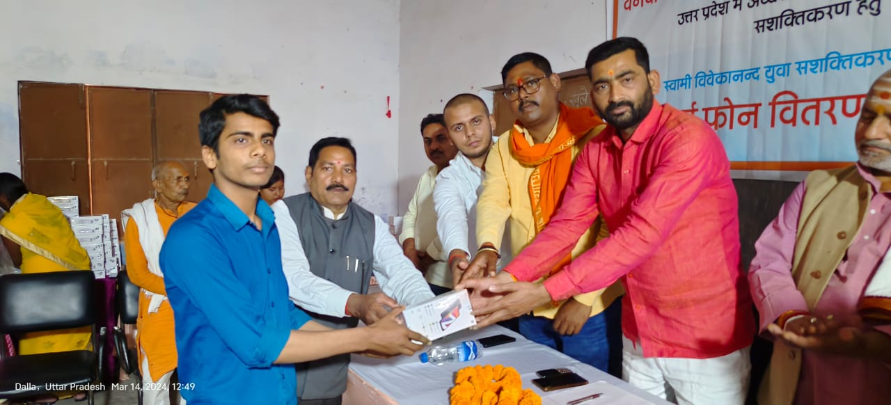 कार्यक्रम का शुभारंभ मुख्य अतिथि डाला मंडल अध्यक्ष दीपक दुबे के साथ अन्य अतिथियों द्वारा मां सरस्वती के चलचित्र पर दीप प्रज्वलित व माल्यार्पण कर सरस्वती वंदना प्रस्तुत किया गया इसके बाद दिवंगत हुए महाविद्यालय के प्रबंधक रहे श्री निवास दुबे के असामयिक निधन पर दो मिनट का मौन रखकर उन्हें श्रद्धांजलि अर्पित की गयी मुख्य अतिथि ने अपने संबोधन में पूर्व प्रबंधक श्री निवास दुबे को याद करते हुए कहा गया की उनके द्वारा लगाया गया पौधा आज विशाल वृक्ष बन चुका है जिसकी छांव में भारत के भविष्य का निर्माण किया जा रहा है आगे संबोधित करते हुए उन्होने कहा कि प्रधानमंत्री मोदी व मुख्यमंत्री योगी के सहयोग से जो स्मार्ट फोन वितरण हो रहा है उसका मकसद है स्मार्ट फोन देकर छात्र-छात्राओं को स्मार्ट बनाना। यदि आप ठान लें तो कोई भी काम असंभव नहीं है। शिक्षा के साथ अनुशासन जरूरी है यदि आप हुनरमंद हैं तो कोई भी काम छोटा बड़ा नहीं होता इसलिए आत्मनिर्भर बने मोबाइल का सदुपयोग करेंगे तो लाभदायक होगा दुरुपयोग करेंगे तो हानिकारक होगाआधुनिक युग में तकनीकी शिक्षा से मजबूत बनने के लिए स्मार्टफोन उपकरण का सही उपयोग करें ।केंद्र व प्रदेश में जब से भाजपा सरकार बनी है तब से भारत बदल रहा है भारत का भविष्य युवाओं के हाथ में है। मुख्यमंत्री योगी का सपना है कि प्रदेश का हर युवा समग्र रूप से सक्षम हो। आज के इस तकनीकी युग में प्रदेश में वितरित किए जा रहे स्मार्ट फोन व टैबलेट से युवा अपनी पढ़ाई व रोजगार को आगे बढ़ाने में सफल हो रहे हैं। कार्यक्रम का संचालन के एन पांडेय ने किया।इस दौरान विशिष्ट अतिथि भाजपा पूर्व मंडल अध्यक्ष मुकेश जैन, संतोष कुमार बबलू,संदीप सिंह पटेल,ओम प्रकाश तिवारी, श्री मुनेश्वर तिवारी, अखिलेश शर्मा, शिव शंकर मौर्य आदि लोग मौजूद रहे।