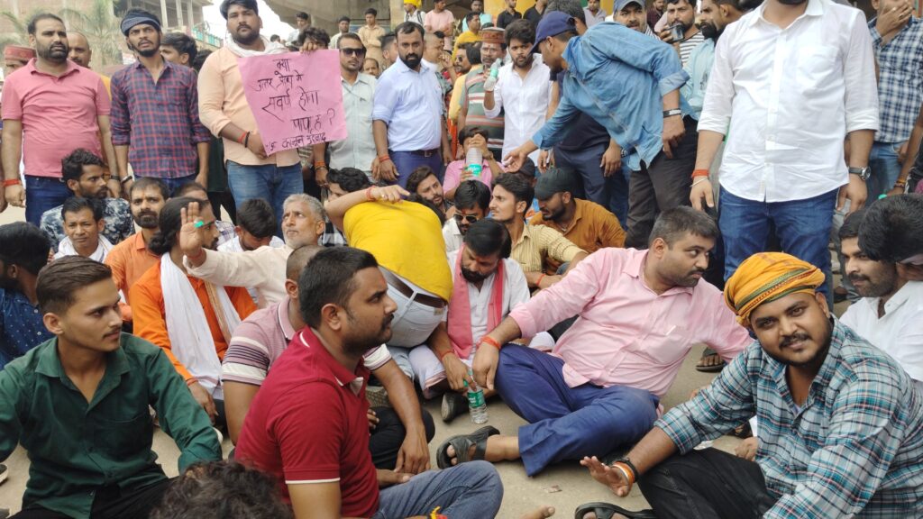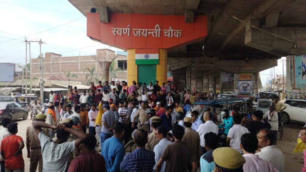 सोनभद्र। राबर्ट्सगंज कोतवाली क्षेत्र के ऊंचडीह वायरल विडियो मामले पुलिस प्रशासन द्वारा कार्यवाही के लिए लिये गये समय बीत जाने के बावजूद ना तो आरोपियों पर मुकदमे की धारा बढ़ाई गई और ना ही सभी अभियुक्तों की गिरफ्तारी ही सुनिश्चित होने से नाराज़ सवर्ण समाज के लोगों ने शनिवार को स्वर्ण जयंती चौक पर विरोध प्रदर्शन करते हुए चक्का जाम किया। इस दौरान अमितेश को न्याय दो की आवाज बुलंद किया। विरोध प्रदर्शन में पहुंचे पूर्वांचल नव निर्माण मंच के पूर्व उपाध्यक्ष गिरीश पाण्डेय ने जिला प्रशासन की कार्यशैली पर सवाल उठाते हुए कहा कि यदि 24 घंटे में दर्ज मुकदमे में हत्या के प्रयास की धारा 307 नहीं बढ़ाया जाता है तो सोनभद्र पुलिस अधीक्षक का घेराव किया जायेगा।