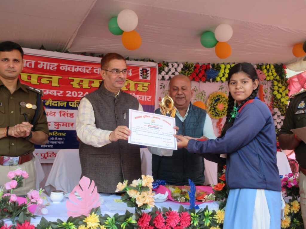 सोनभद्र। सड़क सुरक्षा माह के समापन समारोह कार्यक्रम के दौरान जिलाधिकारी व पुलिस अधीक्षक ने सड़क सुरक्षा समापन कार्यक्रम के दौरान प्रवर्तन की बेहतर कार्यवाही करने पुलिस कर्मियों, दुर्घटना में घायल व्यक्तियों की सहायता प्रदान करने वाले लोगों को, पुलिस के कार्यों में सकारात्मक सहयोग करने वाले लोगों को प्रशस्ति-पत्र देकर सम्मानित किया गया, इस दौरान यातायात माह के दौरान विद्यालयों में आयोजित यातायात प्रतियोगिता, क्वीज प्रतियोगिता में प्रथम, द्वितीय व तृतीय स्थान प्राप्त करने वाले विद्यालयों के छात्र-छात्राओं को प्रशस्ति-पत्र व शील्ड देकर सम्मानित किया गया। इस दौरान अल्ट्राटेक इण्टर मीडिएट कालेज डाला के छात्र-छात्राओं द्वारा सड़क सुरक्षा से सम्बन्धित नुक्कड़ नाटक की सुन्दर प्रस्तुति की गयी।