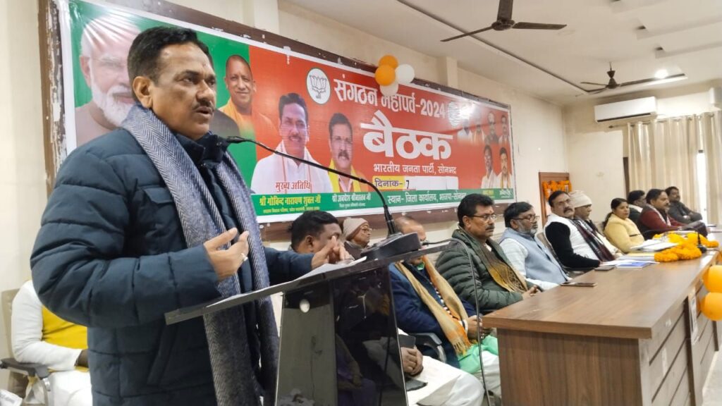 सोनभद्र। भारतीय जनता पार्टी संगठन पर्व 2024 के तहत आयोजित संगठन जिला चुनाव कार्यशाला प्रदेश महामंत्री/विधान परिषद सदस्य गोविन्द नारायण शुक्ला व जिला चुनाव अधिकारी अवधेश श्रीवास्तव की उपस्थिति में भाजपा जिला कार्यालय राबर्ट्सगंज पर सम्पन्न हुयी। कार्यशाला का शुभारंम्भ पं0 दीनदयाल उपाध्याय व डॉ0 श्यामा प्रसाद मुखर्जी जी के चित्र पर मुख्यअतिथि गोविन्द नारायण शुक्ला व जिला चुनाव अधिकारी अवधेश श्रीवास्तव, भाजपा जिलाध्यक्ष नन्दलाल जी, पूर्व सांसद रामशकल जी ने पुष्प अर्पित कर किया। बैठक का संचालन जिला सह चुनाव अधिकारी अनिल सिंह गौतम ने किया। गोविन्द नारायण शुक्ला ने संगठनात्मक चुनाव के अगले चरण की कार्ययोजना साझा करते हुए कहा कि विचारधारा संस्कार और संगठनात्मक पद्धति ही लंबे समय तक संगठन को जीवंत रखते है भाजपा मेरा संगठन है इस विचार से जिले मे अच्छा संगठन तैयार करने की समझ के साथ रायसुमारी करें गुणात्मकता के साथ संगठन चुनाव के चार चरण पूर्ण हो चुके है हम अगले चरण के लिए आगे बढ़ रहे है।