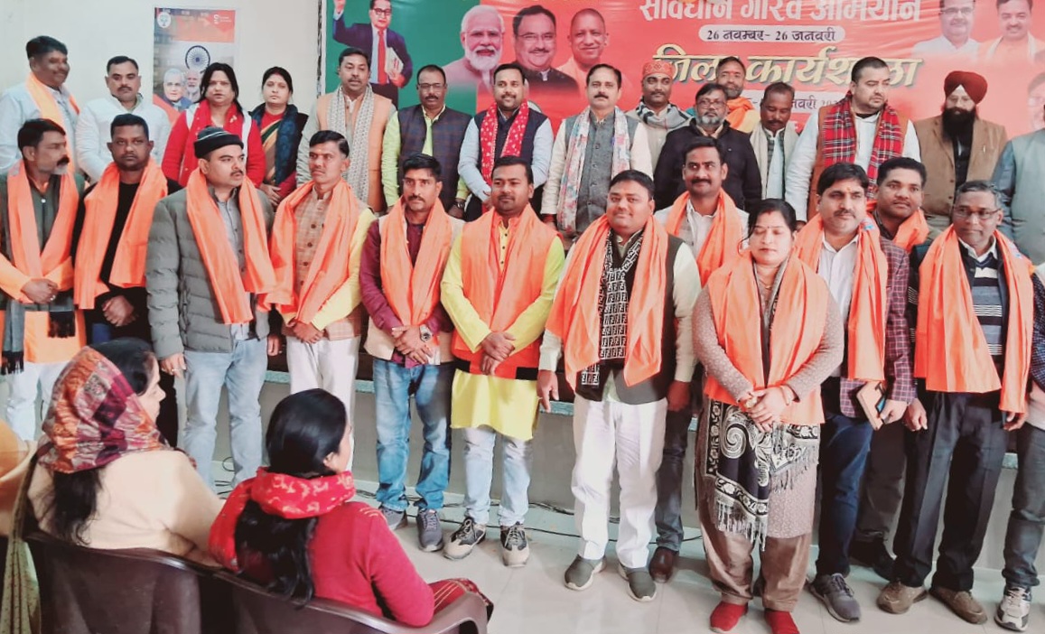 कार्यशाला की अध्यक्षता भाजपा जिलाध्यक्ष नन्दलाल जी व संचालन जिला महामंत्री/कार्यक्रम संयोजक कृष्णमुरारी गुप्ता ने किया।कार्यशाला को संबोधित करते हुए मुख्यअतिथि अनिल सिंह ने कहा कि संविधान गौरव अभियान भारतीय संविधान के 75 वर्ष पूरे होने पर उत्सव स्वरुपी अभियान है, बाबा साहब भीमराव अंबेडकर जी ने जिस पथ पर चलने का सपना देखा था आज भारतीय जनता पार्टी उस पथ पर चल रही है बाबा साहब की सोच थी की पूरे देश मे सामाजिक समरसता आर्थिक समरसता व लोगो मे सद्भाव बना रहे तभी देश की उन्नती संभव है जब वो कानून मंत्री थे तभी उन्होने लाये गये धारा 370 का जमकर विरोध किया था उन्होने सदन मे कहा कि कश्मीर अपने देश का अभिन्न हिस्सा है इसको धारा 370 जैसे बेडियो में डालकर देश से अलग करना बहुत ही अनुचित कदम है देश का संविधान बन रहा था तब उनकी सोच थी की इस देश के वे सभी नागरिक जो किसी भी जाति या पंथ के हो उनका जीवन समानरुप से हो इसके लिए उन्होने एक फैक्ट्री एक्ट भी बनाया था। बाबा साहब के पाथेय को उनके सिद्धांत को जिसकी परिकल्पना थी अन्त्योदय, आज बाबा साहब केनाम पर तमाम राजनीतिक दल अपनी रोटी सेंकते है और उनके सिद्धांतो उनकी परिकल्पना को भूल जाते है लेकिन आज भारतीय जनता पार्टी की मोदी जी की सरकार द्वारा अन्त्योदय को ध्यान मे रखकर कई योजनाएं केन्द्र व प्रदेश सरकार द्वारा संचालित कि जा रही है जैसे गरीब आवास योजना, गरीब अन्न योजना, गरीब स्वास्थ्य योजना या हर घर नल योजना, यह सब अन्त्योदय को साकार करने की सबसे महत्वपूर्ण कार्य है।