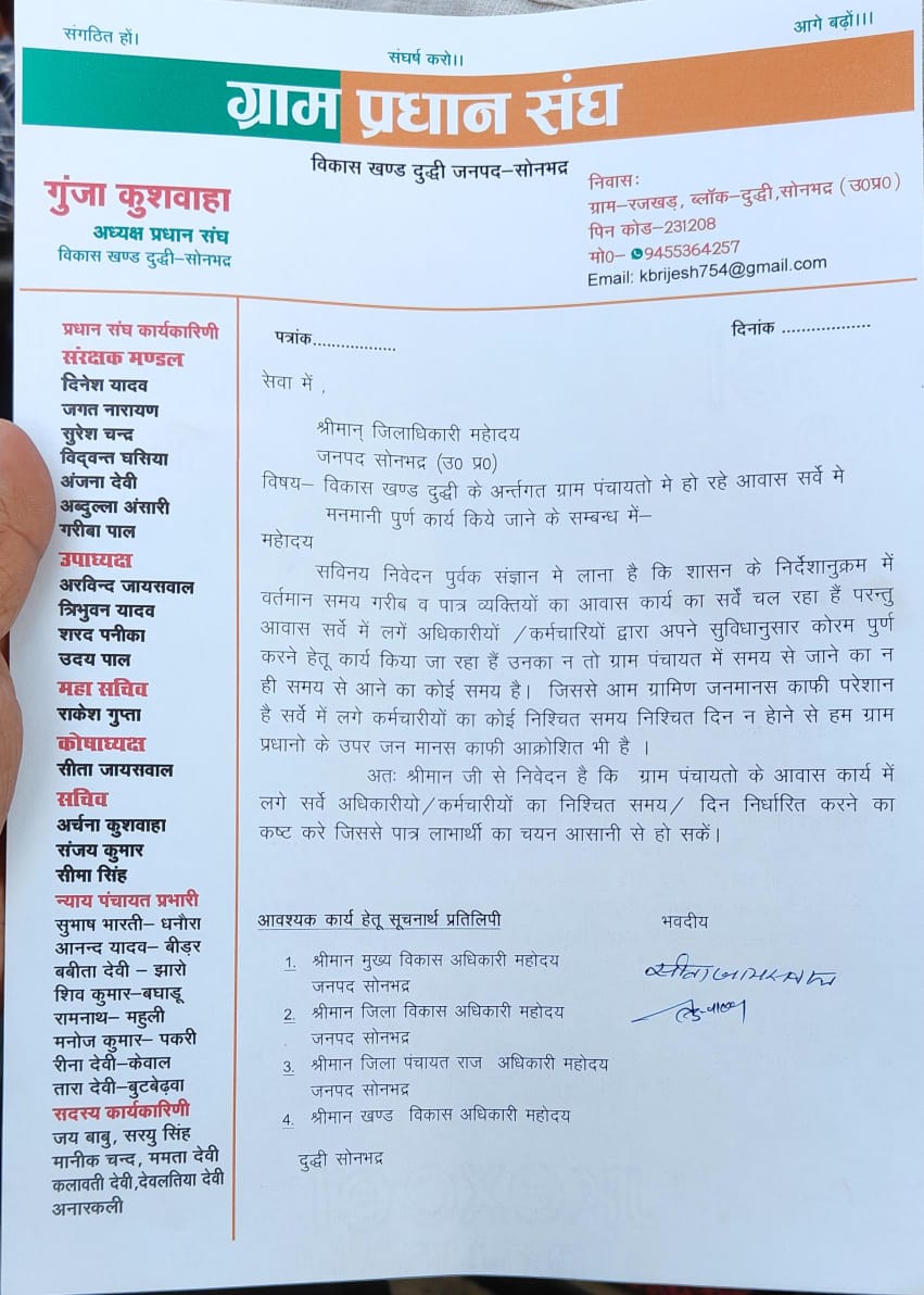 दुद्धी/सोनभद्र (रवि सिंह)-विकास खण्ड दुद्धी के अंतर्गत ग्राम पंचायतो में हो रहे आवास सर्वे में मनमानी पुर्ण कार्य किये जाने के सम्बन्ध में आज बृहस्पतिवार को प्रधान संघ ने जिलाधिकारी के नाम संबोधित ज्ञापन भेजा है ।दिए ज्ञापन में अवगत कराया है कि पुर्वक संज्ञान में लाना है कि शासन के निर्देशानुक्रम में वर्तमान समय गरीब व पात्र व्यक्तियों का आवास कार्य का सर्वे चल रहा है परन्तु आवास सर्वे में लगें अधिकारीयों / कर्मचारियों द्वारा अपने सुविधानुसार कोरम पुर्ण करने हेतू कार्य किया जा रहा हैं उनका न तो ग्राम पंचायत में समय से जाने का न ही समय से आने का कोई समय है। जिससे आम ग्रामिण जनमानस काफी परेशान हाल है ,सर्वे में लगे कर्मचारीयों का कोई निश्चित समय निश्चित दिन न होने से हम ग्राम प्रधानो के ऊपर जन मानस काफी आक्रोशित भी है ।