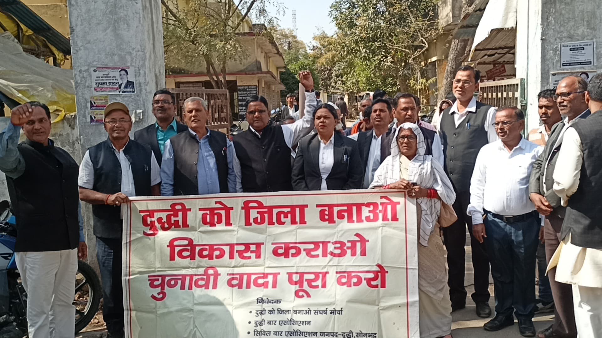 दुद्धी/ सोनभद्र (रवि सिंह,गिरीश तिवारी)-दुद्धी को जिला बनाने की मांग को लेकर जिला बनाओ संघर्षमोर्चा समिति के पदाधिकारियों व अधिवक्ताओं ने शनिवार की दोपहर लगभग 1 बजे कचहरी गेट के मुख्य द्वार पर जमकर प्रदर्शन व नारेबाजी किया। इस दौरान वक्ताओं ने कहा कि तीन प्रान्तों से घिरा हुआ है। यह दुद्धी तहसील क्षेत्र आदिवासी बाहुल्य पिछड़ा, नक्सल प्रभावित क्षेत्र है। दुद्धी तहसील का बॉर्डर सोनभद्र जनपद मुख्यालय से 150 किलोमीटर की दूरी पर है। इसके साथ ही दुद्धी जिला बनने के सभी मानक को भी पूरा कर रहा है और सरकार को भारी मात्रा में रेवेन्यू दुद्धी से मिलता है फिर भी दुद्धी को जिला नही बनाया गया।कहा कि दुद्धी को जिला बनाये जाने की मांग पिछले तीन दशकों से किया जा रहा है।इसके साथ ही चुनाव के दौरान प्रदेश व केंद्र के मंत्रियों व नेताओं ने दुद्धी को जिला बनाने का वादा किया था। इसलिए चुनावी वादा पूरा करते हुए दुद्धी को जिला बनाया जाए और विकास कराया जाए। इस अवसर पर दुद्धी बार एसोसिएशन के अध्यक्ष प्रेमचंद यादव, सिविल बार संघ के अध्यक्ष विष्णुकांत तिवारी, पूर्व अध्यक्ष अधिवक्ता जितेन्द्र श्रीवास्तव, अरुणोदय जौहरी, आनंद कुमार, सत्यनारायण यादव, सन्नो बानो, प्रेमचंद गुप्ता, अमरावती देवी, सहित काफी संख्या में अधिवक्ता गण व मोर्चा के पदाधिकारी मौके पर मौजूद रहे।