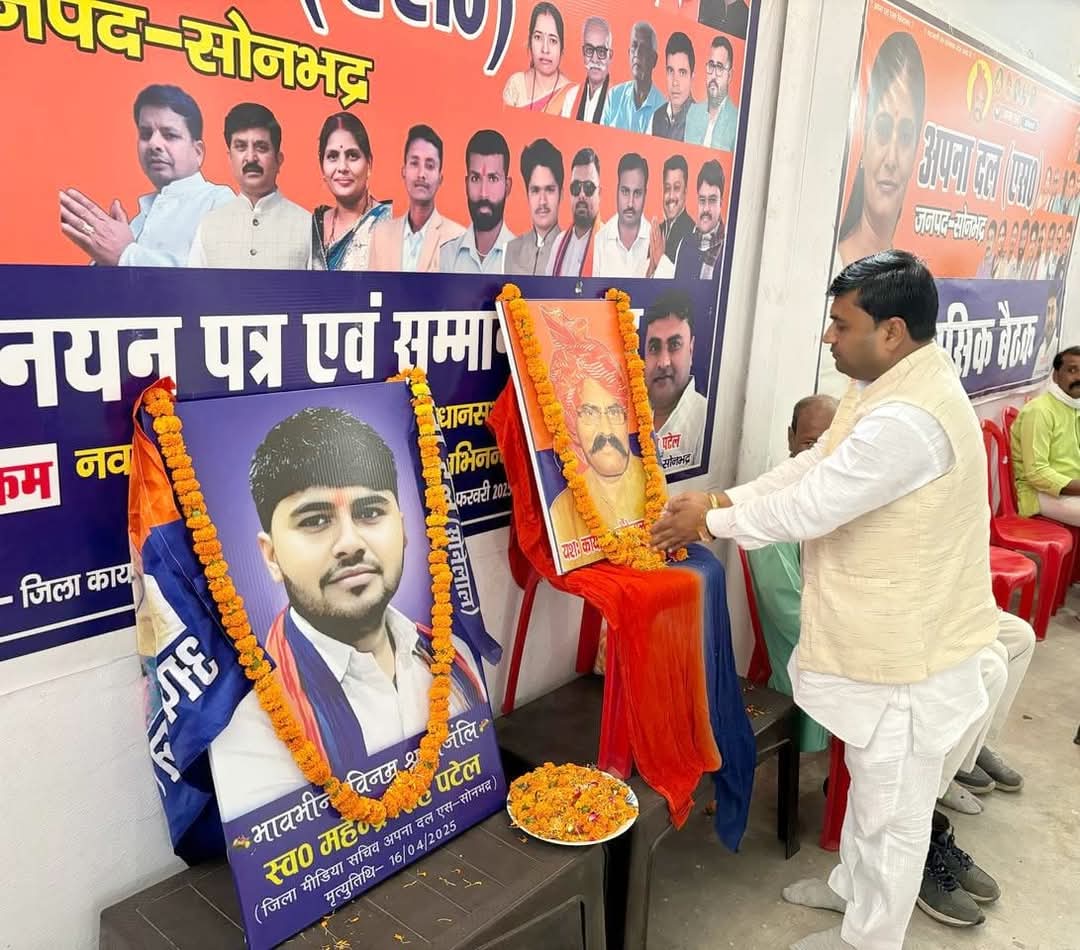सोनभद्र (गिरीश तिवारी):- अपना दल (एस) सोनभद्र की मासिक बैठक एवं श्रद्धांजलि सभा जिलाध्यक्ष श्री अंजनी पटेल की अध्यक्षता में जिला कार्यालय छपका रॉबर्ट्सगंज में बुधवार को सम्पन्न हुई जिसमें दिनांक 16 अप्रैल 2025 को असमय दिवंगत हुए पार्टी के समर्पित पदाधिकारी स्वर्गीय महेंद्र पटेल एवं ग्राम कुसुंहा घोरावल निवासी श्री रामसूरत पटेल तथा बौद्धिक मंच जिलाध्यक्ष श्री आजाद भाई पटेल की धर्मपत्नी के आकस्मिक निधन पर गहरा शोक व्यक्त किया गया, श्रद्धांजलि सभा में स्व. महेंद्र पटेल के पिता श्री चंद्रशेखर पटेल की उपस्थिति ने पूरे वातावरण को भावविभोर कर दिया, कार्यक्रम का सफल संचालन जिला महासचिव श्री राजकुमार बौद्ध द्वारा किया गया, कार्यक्रम की शुरुआत में उपस्थित सभी पदाधिकारियों ने पार्टी के संस्थापक यशस्वी डॉ. सोनेलाल पटेल एवं स्व. महेंद्र सिंह पटेल (पूर्व जिला मीडिया सचिव) के चित्र पर पुष्पांजलि अर्पित कर श्रद्धा सुमन अर्पित किए,