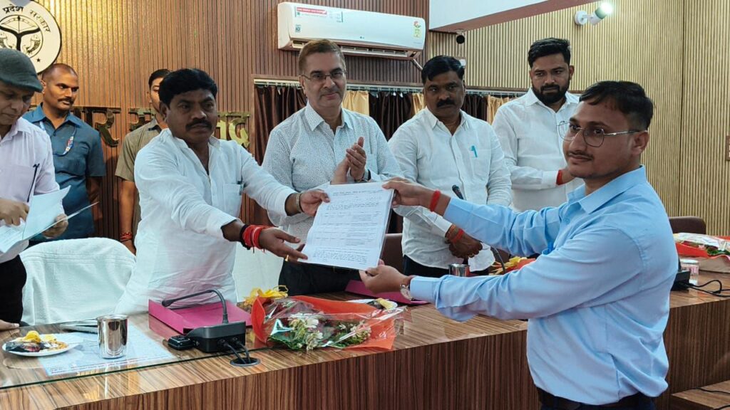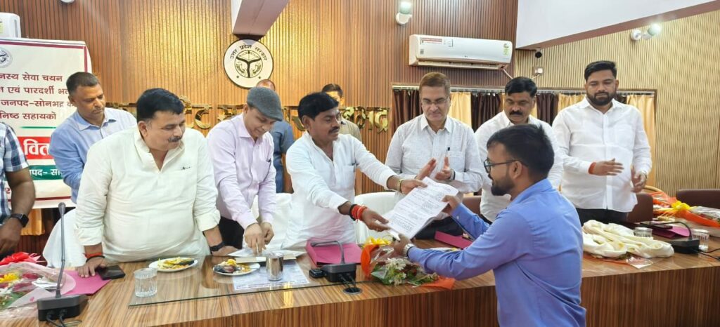 सोनभद्र। जिले के कलेक्ट्रेट सभागार में आज उत्तर प्रदेश अधीनस्थ सेवा चयन आयोग में चयनित पांच लाभार्थियों को नियुक्त पत्र बांटा गया जिसमें बतौर मुख्य अतिथि पहुंचे समाज कल्याण राज्य मंत्री संजीव गौड़ ने जहां नए चयनित अभ्यर्थियों को शुभकामनाएं दीं। वही आज पूरे प्रदेश में नियुक्ति पत्र वितरण कार्यक्रम आयोजित हुआ। जिसमें करीब 1112 कनिष्ठ सहायक और 22 एक्स-रे टेक्नीशियन को नियुक्ति पत्र सौंपे गए। इसी कड़ी में सोनभद्र में भी 5 कनिष्ठ सहायकों को नियुक्ति पत्र दिए गए।
