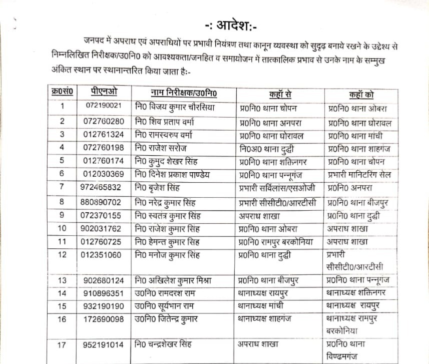सोनभद्र। पुलिस अधीक्षक अशोक कुमार मीणा ने आज जिले में कानून व्यवस्था को मजबूत करने के लिए बड़े स्तर पर फेर बदल किए हैं। पुलिस अधीक्षक ने दो दिनों में कई पुलिस अधिकारियों के कार्यक्षेत्र में बदलाव किया है। जिले में तैनात 31 उपनिरीक्षकों के तबादले के बाद फिर 14 पुलिस अधिकारियों के कार्यक्षेत्र बदले गए। इनमें 9 थाना प्रभारी व 3 थानाध्यक्ष शामिल हैं। आपको बता दें की विजय कुमार चौरसिया को चोपन से ओबरा थाना प्रभारी बनाया गया है। राजेश कुमार सिंह को अपराध शाखा का प्रभार दिया गया है तो शिव प्रताप वर्मा को अनपरा से घोरावल की जिम्मेदारी मिली है इसके साथ ही रामस्वरूप वर्मा को घोरावल से मांची थाना प्रभारी बनाया गया है। वही कुमुद शेखर सिंह को शक्तिनगर से चोपन, दिनेश प्रकाश पाण्डेय को पन्नुगंज से मॉनिटरिंग सेल, राजेश सरोज को दुद्धी से शाहगंज का प्रभार मिला है। बूजेश सिंह को सर्विलांस से अनपरा थाना प्रभारी बनाया गया है। इसके साथ ही चंद्रशेखर सिंह को विंढामगंज, नरेंद्र कुमार सिंह को बीजपुर, स्वतंत्र कुमार सिंह को दुद्धी और अखिलेश कुमार सिंह को पन्नुगंज थाना प्रभारी नियुक्त किया गया है। थानाध्यक्षों में दशरथ राम को शक्तिनगर, सूर्यभान राम को रायपुर और जितेंद्र कुमार को रामपुर बरकोनिया का प्रभार मिला है।