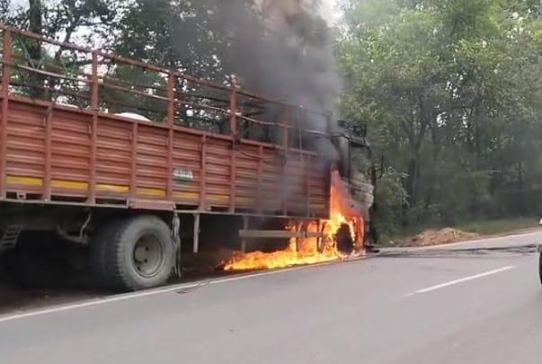 लपटों से घिरा वाहन, केबिन पूरी तरह जलकर राख