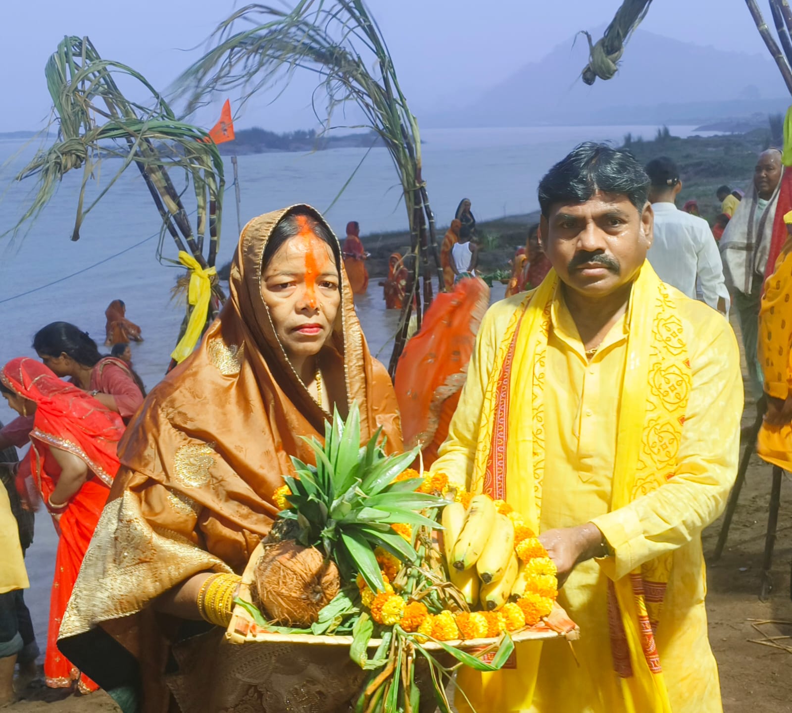 राज्य मंत्री संजीव सिंह गोंड़ ने पत्नी संग सोन नदी में उतरकर दिया प्रथम अर्घ्य, श्रद्धा और उत्साह से नहाया जनसैलाब