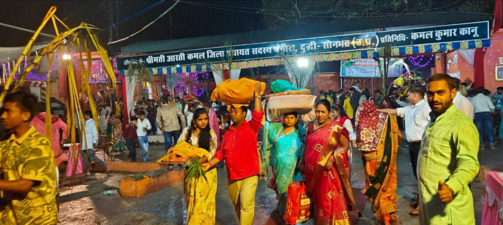 सोमवार को डाला छठ के पर्व पर दोपहर बाद दुद्धी में तेज बारिश होने लगी ,लेकिन इस बेमौसम बरसात पर आस्था भारी पड़ी। व्रती महिलाएं व उनके परिजन भीगते हुए विभिन्न घाटों को प्रस्थान किये और नियत समय पर अस्तताचल गामी सूर्य को पहला अर्घ्य दिया।कस्बे के शिवाजी मराठा तालाब सहित खजूरी , जाबर , धनौरा , बीडर , रजखड़ ,डूमरडीहा ,अमवार आदि ग्रामों में भी विभिन्न छठ घाटों पर आस्था का जनसैलाब उमड़ पड़ा ,व्रतियों ने अस्तताचलगमी सूर्य को अर्घ्य दे मन्नते मांगी।