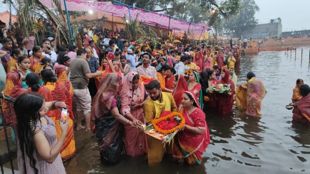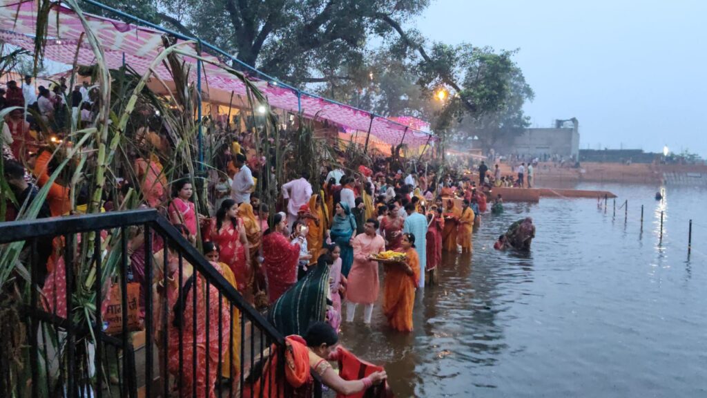 दुद्धी। आस्था का महापर्व छठ के अवसर पर तीसरे दिन सोमवार की शाम व्रती महिलाओं ने अस्तताचल गामी सूर्य को पहला अर्घ्य दिया और परिवार की मंगल की कामना की। व्रतियों विभिन्न सरोवरों में घुटने भर पानी मे उतरकर डूबते सूर्य की परिक्रमा कर अर्घ्य दिया। निसंतानों ने जहां संतान प्राप्त करने की मन्नते मांगी वहीं दूसरी ओर संतान प्राप्त दंपतियों ने अपने संतान सहित परिवार की मंगल कामना की। इसके उपरांत अपने अपने वेदियों पर सूप को रखकर घी के दीप जलाकर छठी मैया की पूजा की। इस दौरान विभिन्न संगठनों के वालेनटियरो सहित पदाधिकारियों ने मोर्चा संभाल रखा था।