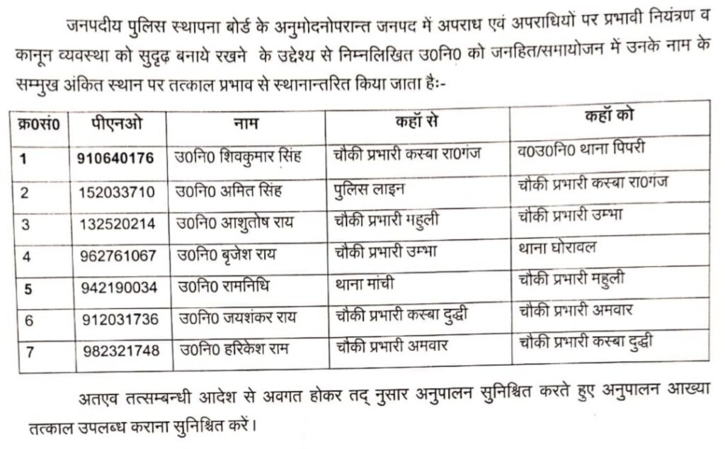 चौकी प्रभारी महुली रहे उपनिरीक्षक आशुतोष राय को चौकी प्रभारी उम्भा बनाया गया है, जबकि उम्भा चौकी प्रभारी दुर्जेश राय को अब थाना घोरावल का दायित्व मिला है।इसके अलावा थाना मांची से उपनिरीक्षक रामनिधि को चौकी प्रभारी महुली बनाया गया है। चौकी प्रभारी दुद्धी उपनिरीक्षक जयशंकर राय को चौकी प्रभारी अमवार भेजा गया है और अमवार के प्रभारी रहे उपनिरीक्षक हरिकेश राम को चौकी प्रभारी दुद्धी का जिम्मा सौंपा गया है।पुलिस सूत्रों के अनुसार यह फेरबदल अपराध नियंत्रण, बेहतर कानून व्यवस्था और पुलिसिंग में तेजी लाने के लिए किया गया है। सभी उपनिरीक्षकों को तत्काल कार्यभार ग्रहण करने के निर्देश दिए गए हैं।
