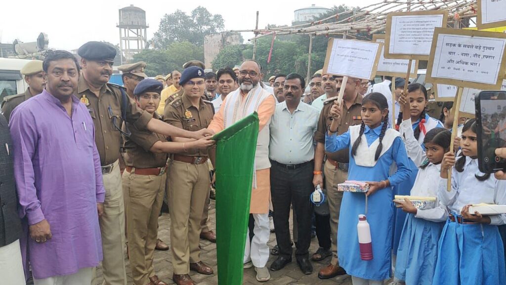 सोनभद्र। सदर विधायक व पुलिस अधीक्षक आज यातायात माह नवम्बर का शुभारम्भ रामलीला मैदान से किया गया। कार्यक्रम का आयोजन पुलिस विभाग द्वारा सड़क सुरक्षा एवं यातायात नियमों के पालन के प्रति आमजन को जागरूक करने के उद्देश्य से किया गया।कार्यक्रम का शुभारम्भ मुख्य अतिथि भूपेश चौबे (सदर विधायक, रॉबर्ट्सगंज) तथा पुलिस अधीक्षक अभिषेक वर्मा द्वारा दीप प्रज्वलित कर किया गया। कार्यक्रम के दौरान पुलिस अधीक्षक ने मुख्य अतिथि भूपेश चौबे को पुष्पगुच्छ एवं शाल भेंट कर सम्मानित किया। इस अवसर पर पुलिस अधीक्षक ने उपस्थित जनसमूह को संबोधित करते हुए कहा कि यातायात नियमों का पालन केवल कानूनी दायित्व नहीं, बल्कि यह हमारी संवेदनशीलता और अनुशासन का प्रतीक है। एक क्षण की लापरवाही किसी परिवार की ज़िंदगी बदल सकती है। अतः हर नागरिक को चाहिए कि सड़क पर स्वयं की सुरक्षा के साथ दूसरों की सुरक्षा का भी ध्यान रखे तभी हमारा जनपद ‘सुरक्षित यातायात’ की मिसाल बनेगा।