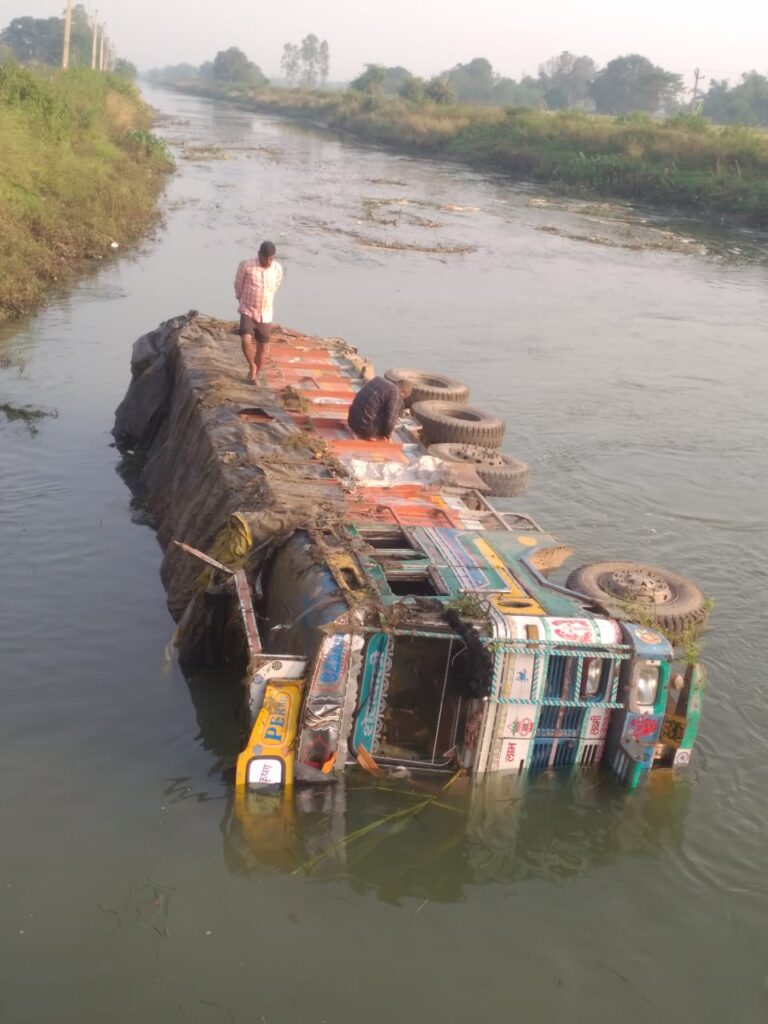 एक ट्रक अनियंत्रित होकर नहर में पलट गया। इस