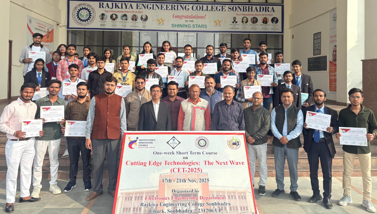 राजकीय इंजीनियरिंग कॉलेज सोनभद्र में एक सप्ताह चलने वाला शॉर्ट टर्म कोर्स “कटिंग एज टेक्नोलॉजीज़: द नेक्स्ट वेव” गरिमामय माहौल में सफलतापूर्वक सम्पन्न हुआ। समापन समारोह में मुख्य अतिथि के रूप में इलाहाबाद विश्वविद्यालय के डॉ. तरुण कुमार गुप्ता उपस्थित रहे, जबकि कार्यक्रम की अध्यक्षता कॉलेज के निदेशक प्रो. जी. एस. तोमर ने की।कार्यक्रम में डीन शैक्षणिक डॉ. हिमांशु कटियार, डीन छात्र कल्याण डॉ. देवेंद्र कुमार त्रिपाठी, कुलसचिव डॉ. आर. के. पटेल, कंप्यूटर साइंस विभागाध्यक्ष डॉ. अमोद कुमार तिवारी, इलेक्ट्रिकल इंजीनियरिंग विभागाध्यक्ष डॉ. विजय प्रताप सिंह और आयोजन सचिव श्री प्रशांत पांडेय सहित कई गणमान्य सदस्य मौजूद रहे।