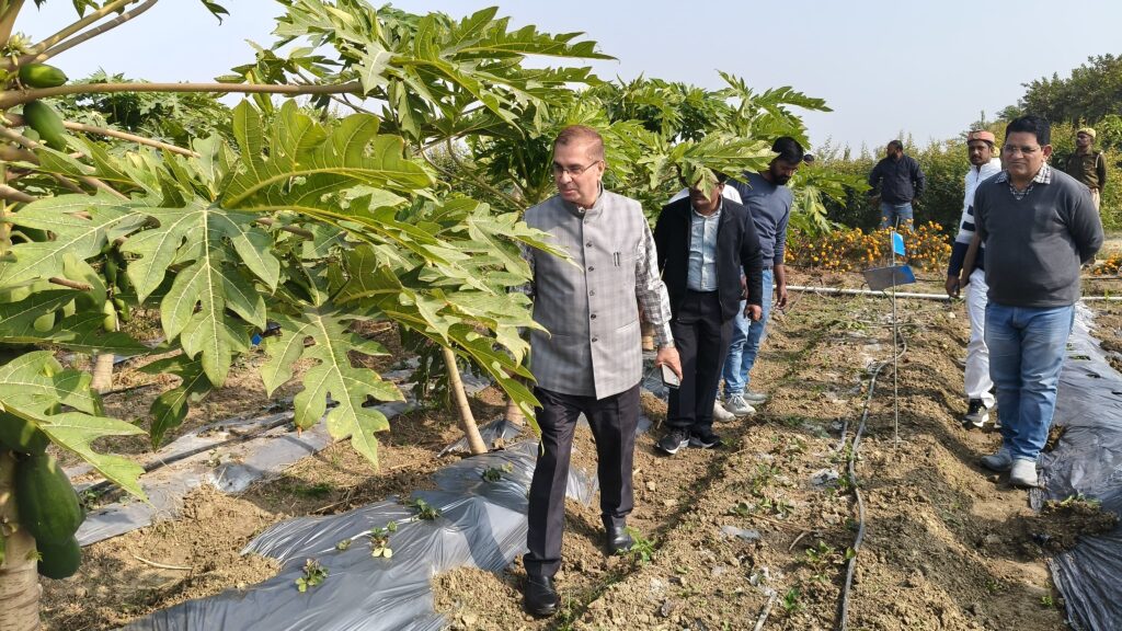 जिलाधिकारी बी.एन. सिंह ने राबर्ट्सगंज ब्लॉक के कुसी गांव में किसानों द्वारा की जा रही तकनीकी खेती और बागवानी का स्थलीय निरीक्षण किया। वे किसान भोला के खेत पर पहुंचे, जहां एक ही परिसर में पपीता, ड्रैगन फ्रूट, स्ट्रॉबेरी, सूरन, अमरूद और केला की उन्नत खेती की जा रही है।तकनीकी पद्धति से की जा रही इस बहु-फसली खेती को देखकर जिलाधिकारी ने संतोष व्यक्त किया और कहा कि सोनभद्र के किसान आधुनिक कृषि तकनीकों को अपनाकर अपनी आय में लगातार वृद्धि कर रहे हैं। इससे न सिर्फ किसानों का जीवन स्तर बेहतर हो रहा है, बल्कि जिले की पहचान भी तकनीकी आधारित खेती के रूप में बन रही है।