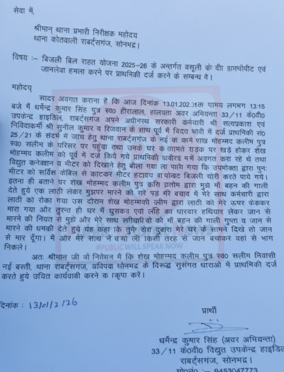 सोनभद्र(AKD/गिरीश तिवारी)- रॉबर्ट्सगंज कोतवाली क्षेत्र में बिजली बिल राहत योजना 2025 ,26 के तहत वसूली और जांच के दौरान बिजली विभाग की टीम पर जानलेवा हमला किए जाने का मामला सामने आया है। इस संबंध में अवर अभियंता धर्मेंद्र कुमार सिंह ने कोतवाली रॉबर्ट्सगंज में लिखित तहरीर देकर प्राथमिकी दर्ज करने की मांग की है।तहरीर के अनुसार 13 जनवरी 2026 को दोपहर लगभग 1:15 बजे 33/11 केवी विद्युत उपकेंद्र हाइडिल, रॉबर्ट्सगंज की टीम विभागीय कार्य से नई बस्ती मोहल्ला सलीम के घर पहुंची थी। पूर्व में दर्ज बिजली चोरी के मामले में जांच और मीटर संबंधी कार्रवाई के दौरान शेख मोहम्मद कलीम द्वारा अभद्र व्यवहार किया गया और विरोध शुरू कर दिया गया।आरोप है कि शेख मोहम्मद कलीम ने गाली-गलौज करते हुए लाठी से हमला किया, जिसमें अवर अभियंता और विभागीय कर्मचारी बाल-बाल बचे। इतना ही नहीं, आरोपी द्वारा धारदार हथियार लेकर जान से मारने की धमकी भी दी गई। स्थिति बिगड़ती देख बिजली विभाग की टीम किसी तरह अपनी जान बचाकर मौके से निकल पाई।अवर अभियंता धर्मेंद्र कुमार सिंह ने मामले को गंभीर बताते हुए शेख मोहम्मद कलीम के खिलाफ सुसंगत धाराओं में मुकदमा दर्ज कर कड़ी कार्रवाई की मांग की है। पुलिस मामले की जांच में जुटी हुई है।