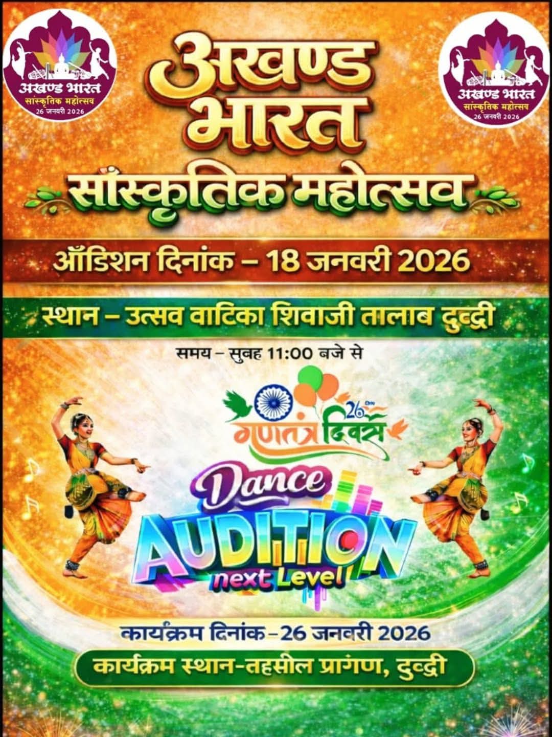 अखंड भारत सांस्कृतिक मंच के तत्वावधान में 26 जनवरी गणतंत्र दिवस के अवसर पर आयोजित होने वाली सांस्कृतिक डांस प्रतियोगिता के लिए ऑडिशन 18 जनवरी को होंगे।मंच के अध्यक्ष संदीप गुप्ता, महामंत्री भोलू जायसवाल और कोषाध्यक्ष मनीष जायसवाल ने बताया कि ऑडिशन सुबह 11 बजे उत्सव वाटिका, शिवाजी तालाब दुद्धी में आयोजित किया जाएगा। चयनित प्रतिभागी 26 जनवरी को तहसील प्रांगण में होने वाली प्रतियोगिता में भाग लेंगे।प्रतियोगिता में प्रथम, द्वितीय और तृतीय स्थान पाने वाले प्रतिभागियों को नगद पुरस्कार दिए जाएंगे। आयोजकों ने अधिक से अधिक बच्चों से भाग लेने की अपील की है।