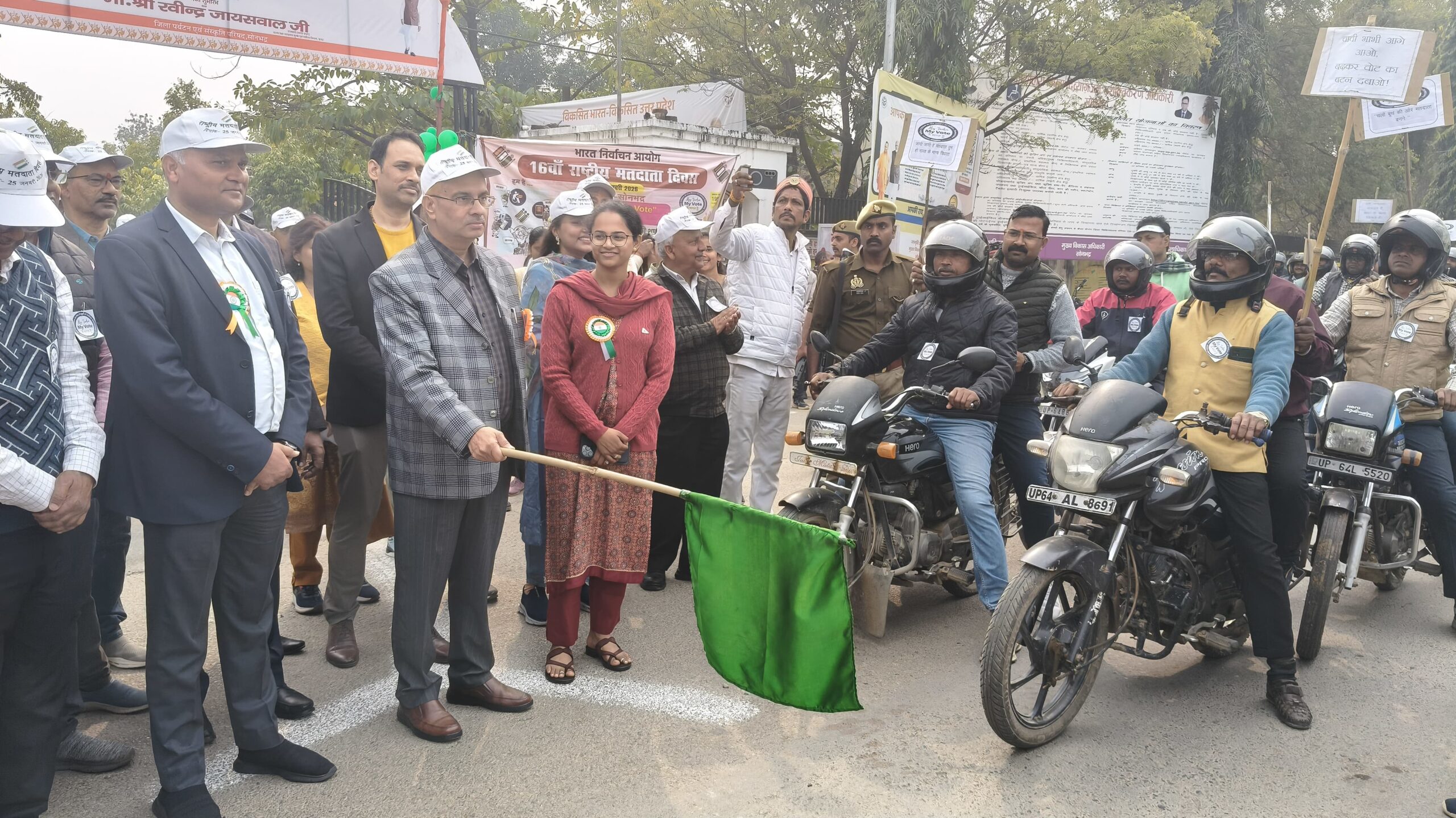 कलेक्ट्रेट परिसर में जिलाधिकारी श्री बी.एन. सिंह की अध्यक्षता में राष्ट्रीय मतदाता दिवस के अवसर पर दिव्यांगजनों को मोटराइज्ड ट्राइसाइकिल और कंबल का वितरण किया गया। पंचायत रिसोर्स सेंटर लोढ़ी के माध्यम से 10 दिव्यांगजन लाभान्वित हुए।श्रीमती हीरामणी चोपन को निःशुल्क ट्राइसाइकिल और कंबल मिलने पर उनके पति श्री बन्धु की आंखों में खुशी के आंसू दिखाई दिए और उन्होंने प्रशासन को धन्यवाद दिया। उन्होंने कहा कि मुख्यमंत्री योगी आदित्य नाथ द्वारा चलायी गई यह योजना दिव्यांगजनों के लिए बहुत उपयोगी है और इससे वे अपने दैनिक काम और छोटे व्यवसाय में स्वतंत्रता पा सकते हैं।कार्यक्रम में ब्लॉक प्रमुख श्रीमती लीला सिंह गोंड ने मतदाता जागरूकता रैली का हरी झंडी दिखाकर शुभारंभ किया। दिव्यांगजन सशक्तीकरण विभाग, बचपन डे केयर सेंटर और संकेत मूकबधिर विद्यालय के कर्मचारी एवं दिव्यांगजन पूरे मनोयोग से कार्यक्रम में शामिल हुए और मतदाता शपथ ली।जिला दिव्यांगजन सशक्तीकरण अधिकारी श्रीमती विद्या देवी ने सभी प्रतिभागियों का धन्यवाद किया और बताया कि जनपद के सभी दिव्यांगजन कल्याणकारी योजनाओं का पूरा लाभ प्राप्त कर सकते हैं। मौके पर कई अधिकारी और कर्मचारी भी उपस्थित रहे।