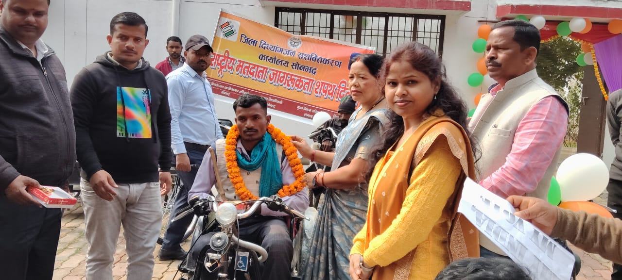 मोटराइज्ड ट्राइसाइकिल पाकर सभी लाभार्थियों के चेहरे खुशी से खिल उठे और उन्होंने उत्तर प्रदेश सरकार की इस कल्याणकारी योजना की प्रशंसा की। इसी अवसर पर ब्लॉक प्रमुख चोपन श्रीमती लीला सिंह गोंड द्वारा मतदाता जागरूकता रैली को हरी झंडी दिखाकर रवाना किया गया। कार्यक्रम में उपस्थित दिव्यांगजनों एवं विभागीय कर्मचारियों ने मतदाता शपथ ग्रहण कर भविष्य में शत-प्रतिशत मतदान का संकल्प लिया। ब्लॉक प्रमुख ने दिव्यांगजनों को सरकार की विभिन्न योजनाओं की जानकारी देते हुए मतदान के महत्व पर प्रकाश डाला।कार्यक्रम के अंत में जिला दिव्यांगजन सशक्तीकरण अधिकारी श्रीमती विद्या देवी ने धन्यवाद ज्ञापन करते हुए कहा कि जनपद के सभी पात्र दिव्यांगजन विभाग की योजनाओं का शत-प्रतिशत लाभ प्राप्त कर सकते हैं। इस अवसर पर विभागीय अधिकारी, कर्मचारी, सामाजिक संगठन के प्रतिनिधि एवं बड़ी संख्या में दिव्यांगजन उपस्थित रहे।