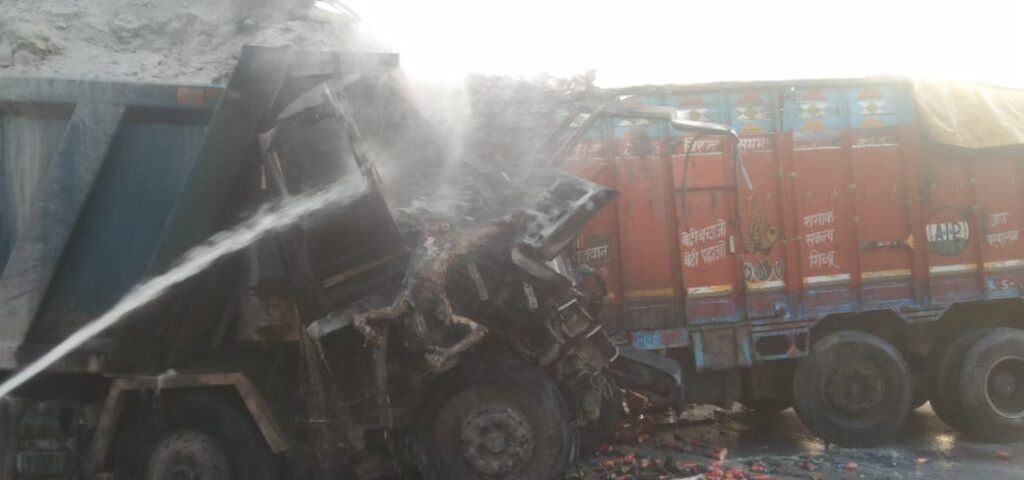 डाला/सोनभद्र । हाथीनाला थाना क्षेत्र में शनिवार शाम एक दिल दहला देने वाला सड़क हादसा हुआ, जहां दो ट्रकों की आमने-सामने टक्कर के बाद भीषण आग लग गई। हादसे में दो लोगों की जिंदा जलकर मौत हो गई, जबकि एक व्यक्ति गंभीर रूप से घायल हो गया, जिसे अस्पताल में भर्ती कराया गया है। घटना के बाद इलाके में अफरा-तफरी मच गई और मौके पर पुलिस व दमकल की टीमें पहुंच गईं।वाराणसी-शक्तिनगर मार्ग पर हथवानी गांव के पास करीब शाम 5 बजे दोनों ट्रकों की जोरदार भिड़ंत हुई। टक्कर इतनी जबरदस्त थी कि दोनों वाहनों में तुरंत आग लग गई और आग ने तेजी से विकराल रूप ले लिया। हादसे के समय ट्रकों में सवार चालक और खलासी फंस गए। स्थानीय लोगों और पुलिस की मदद से एक चालक को बाहर निकालकर गंभीर हालत में हिंडाल्को अस्पताल भेजा गया।
